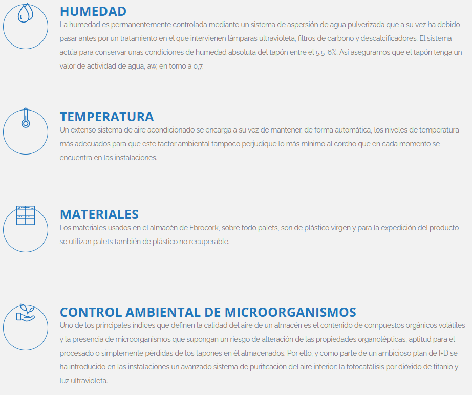 El corcho es un material inerte, poco o nada biodegradable, pero sensible a las condiciones ambientales. Su destino, además, es guardar -quizá durante años- un elemento vivo, que evoluciona, como es el vino. Por ello, en Ebrocork aplicamos nuestra filosofía de calidad también a las instalaciones donde se elaboran y almacenan los tapones de corcho en cuatro parámetros fundamentales: